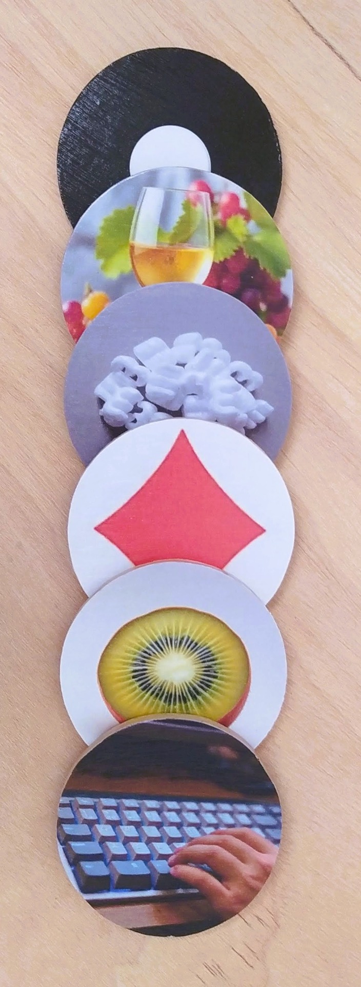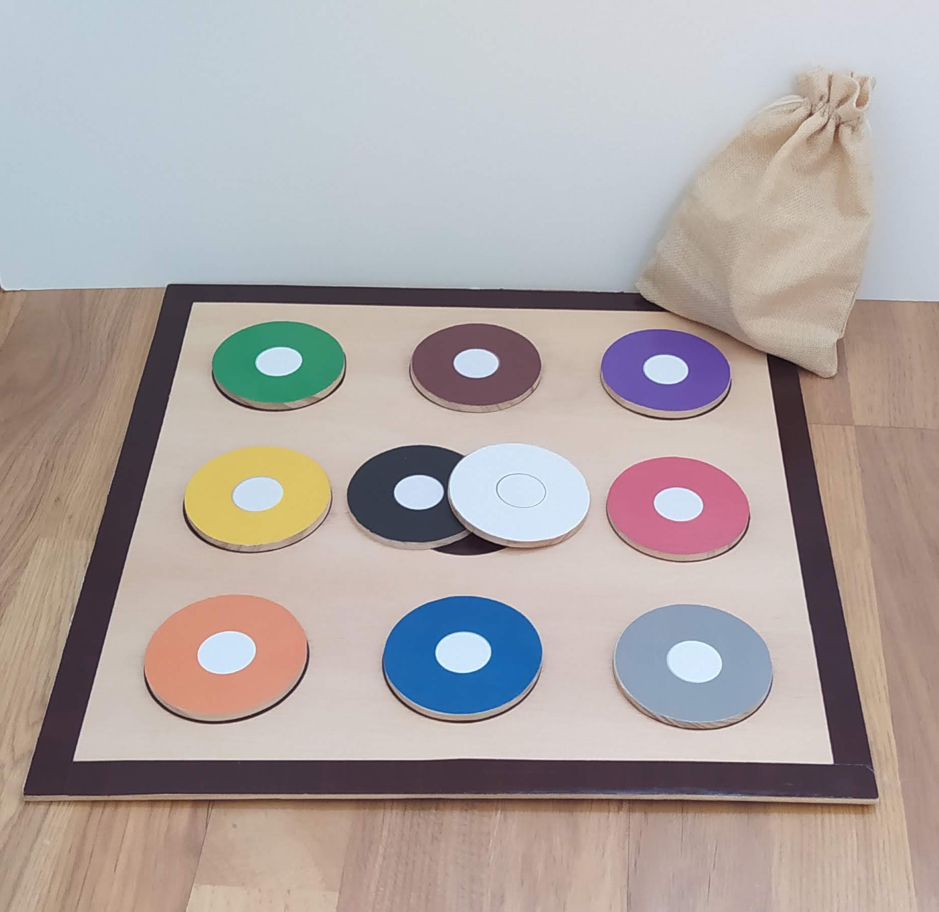 • 10 peças de madeira (8 cm x 0,5 cm) com as cores: Azul, amarelo, vermelho, verde, laranja, roxo, castanho, cinzento, preto e branco