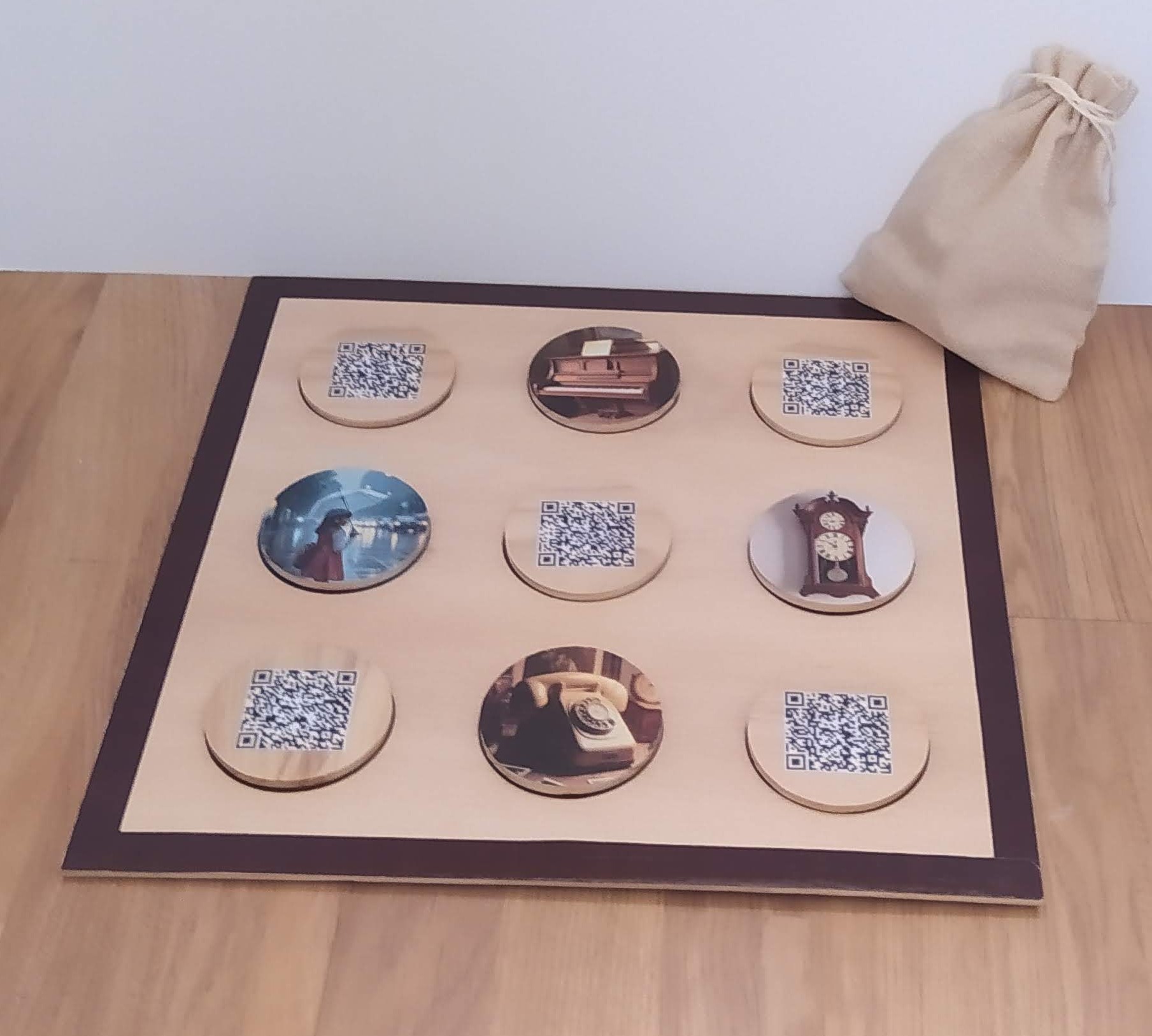 9 peças com as imagens: teclado, sino, piano, fogo de artificio, mota, telefone, secador cabelo, relógio de pêndulo e chuva e os respectivos QR Codes do lado oposto