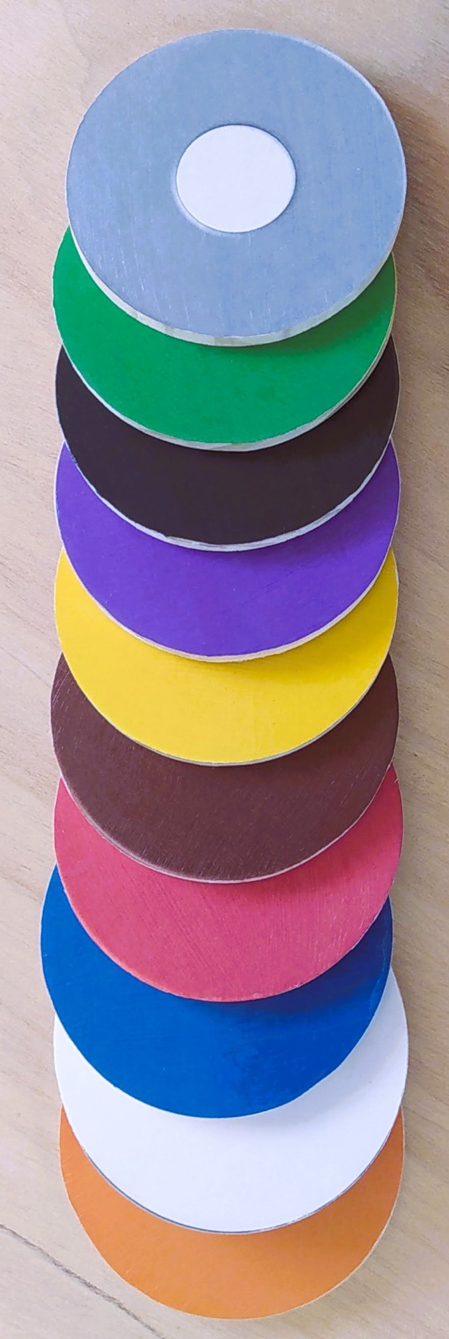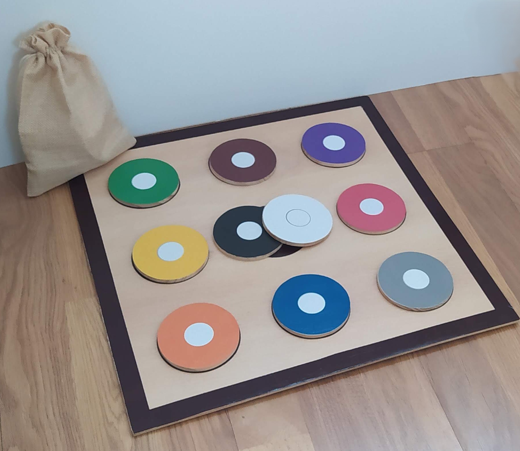 10 peças com as cores: azul, vermelho, amarelo, laranja, verde, roxo, castanho, cinzento, preto e branco