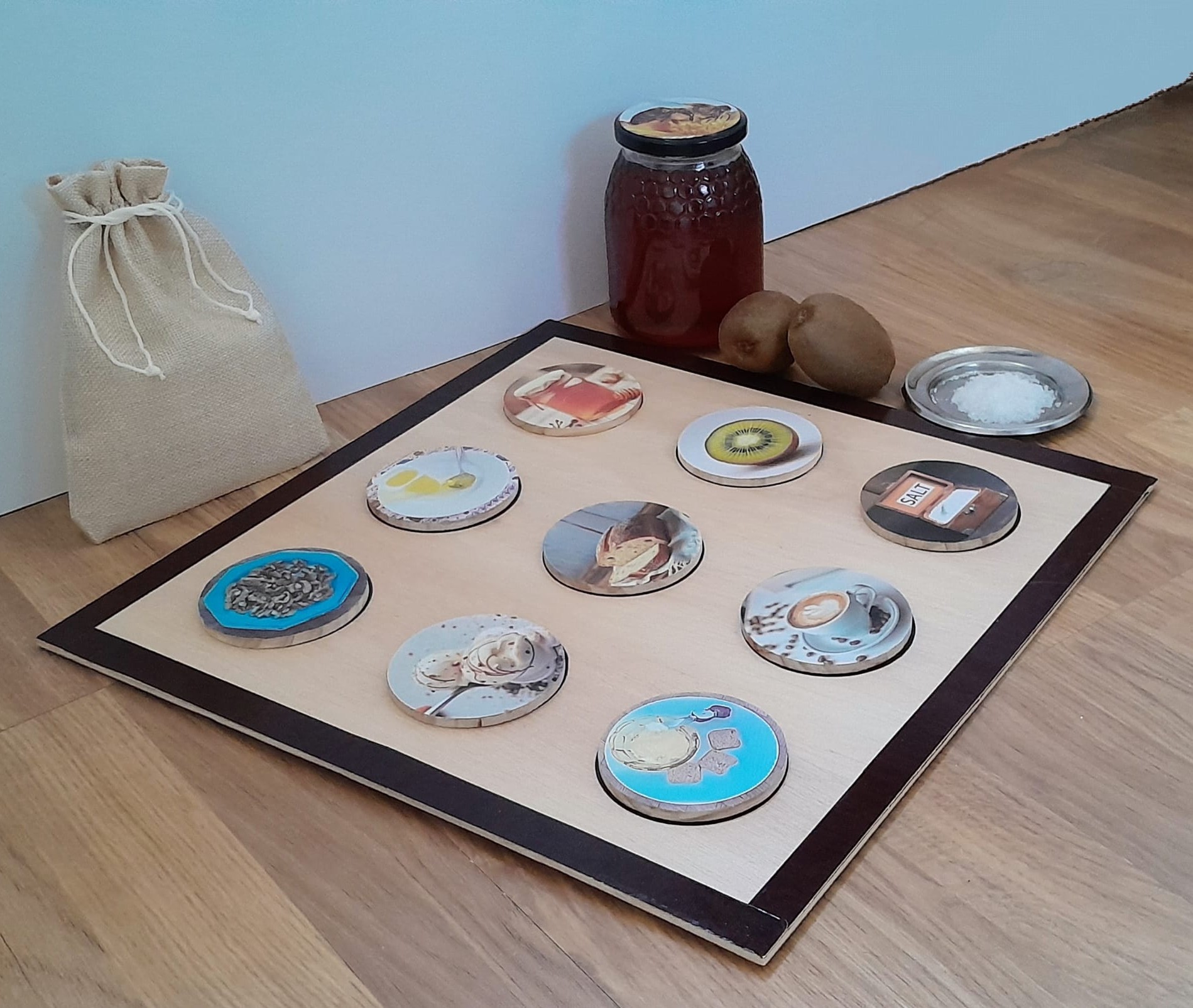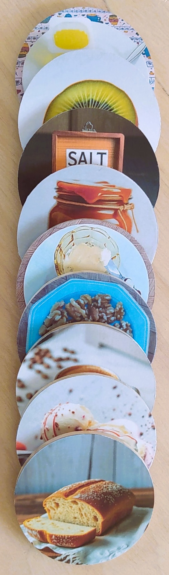 9 peças com as imagens: gelatina, kiwi, sal, mel, manteiga, nozes, café, gelado e pão